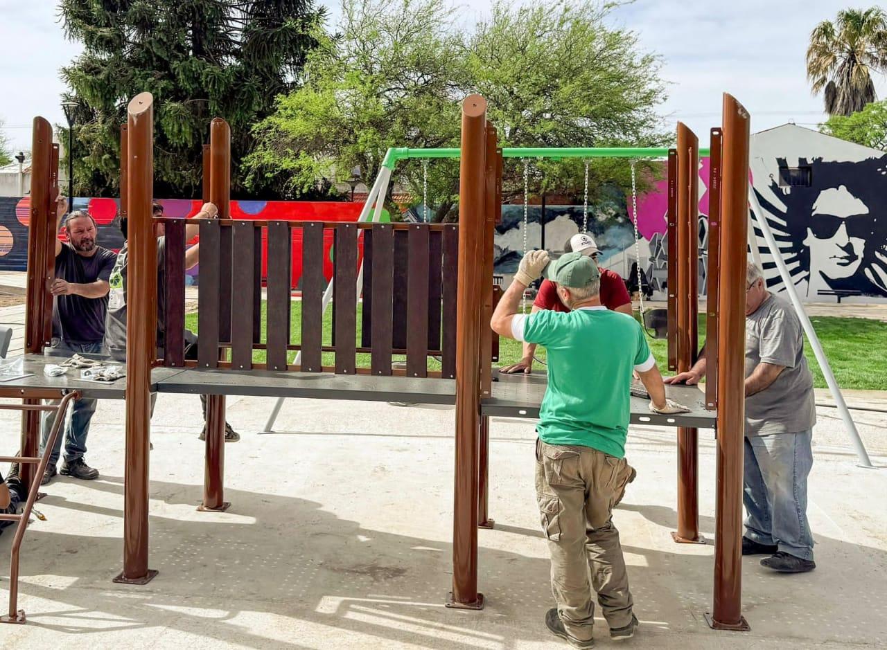 La obra, que ya alcanzó el 80% de ejecución, incluye nuevas veredas que se están haciendo, la instalación de nuevo mobiliario urbano y la incorporación de juegos. Al mismo tiempo, la pintura le da una nueva vida al espacio, junto con la colocación de nueva iluminación y un mural imponente que repasará la vida del cantante y lo vinculará con espacios icónicos de Santa Rosa.