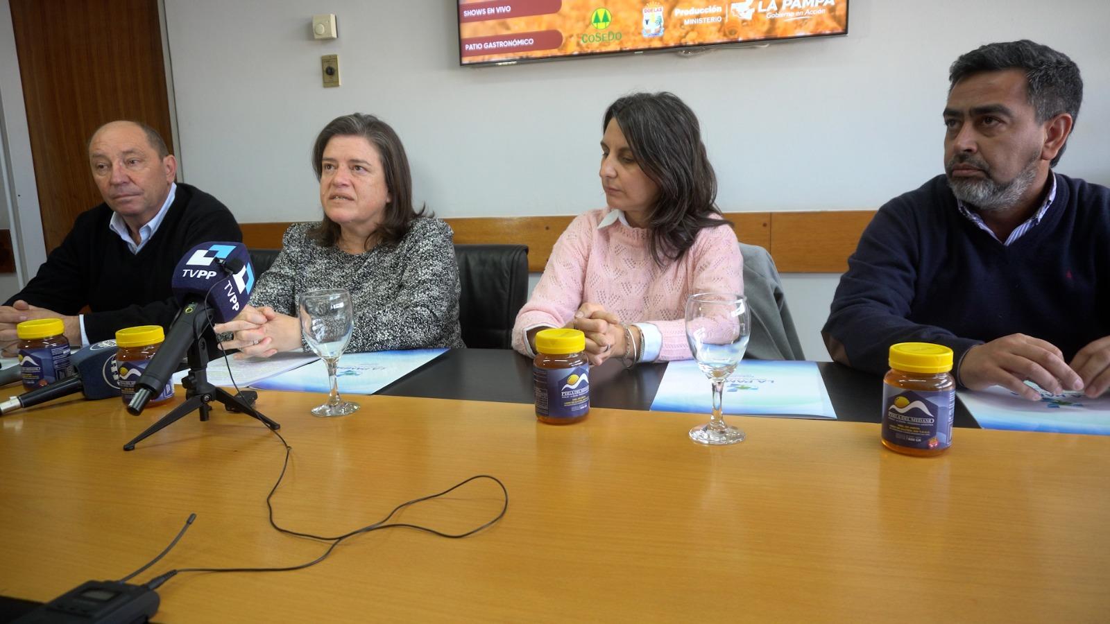 La ministra de la Producción, Fernanda González; la intendenta de Doblas, Anelisa Gómez; el presidente de la COSEDO, Jorge Páez y el subsecretario de Asuntos Agrarios, Ricardo Baraldi, anunciaron la realización, el próximo fin de semana, de la 26° edición de la Expo Apícola Doblas.