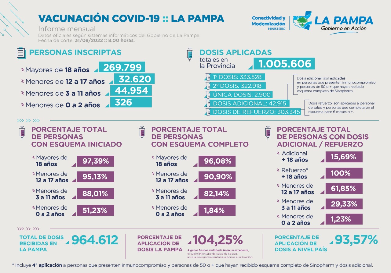 El Gobierno de La Pampa, a través de los Ministerios de Conectividad y Modernización y de Salud, informó a través de los cuadros demostrativos publicados adjunto, la marcha del Plan de Vacunación contra la COVID-19 en la provincia de La Pampa.