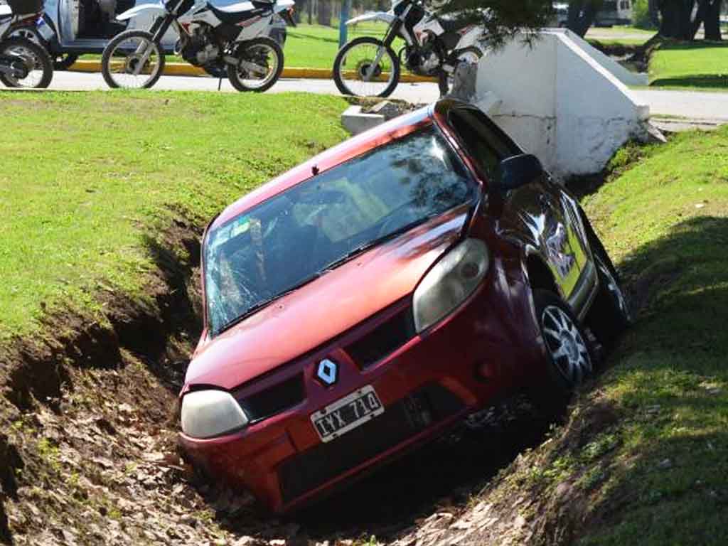 Los vehículos involucrados son dos Renault Sandero, uno rojo y el otro gris. Chocaron en el ingreso a la estación de servicio y uno de los autos cayó dentro de uno de los canales de desagüe, debido a la violencia del impacto.