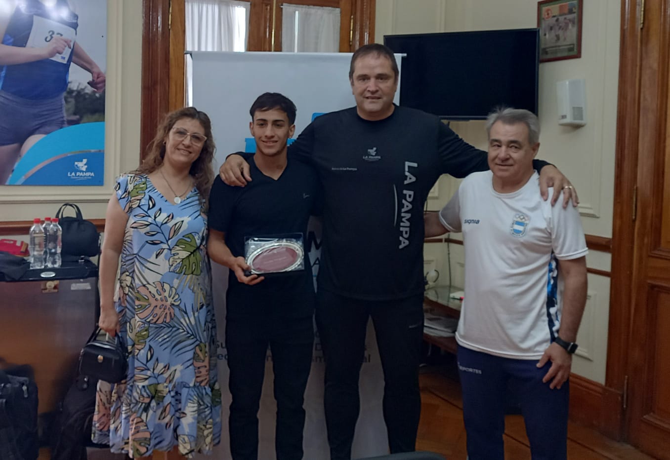 “Es un reconocimiento a un nadador excepcional, que siempre representó a su Club y la Provincia de manera sensacional y que ahora hará un corte en su relación para seguir con sus estudios”, explicó el subsecretario Ceferino Almudévar en el acto de entrega de la plaqueta «en nombre del Gobierno de La Pampa y para que luzca en la repisa de tu departamento”.